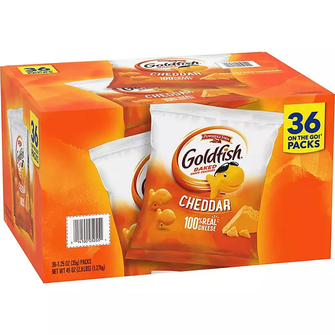 This snack pack contains 36 single-serve pouches of classic Cheddar Goldfish crackers. Each pouch is 1.25-oz., making it the perfect size for on-the-go snacking or for packing in lunches. Whether you're heading out for a road trip or packing a lunch for school or work, these convenient snack packs make it easy to enjoy your favorite cheesy treat anywhere, anytime.