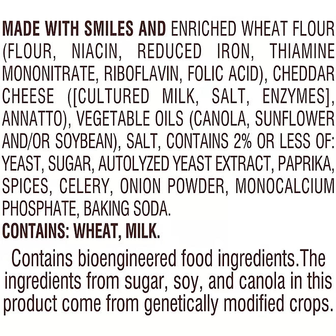 Ingredients: Enriched Wheat Flour (Flour, Niacin, Reduced Iron, Thiamine Mononitrate, Riboflavin, Folic Acid), Cheddar Cheese ([Cultured Milk, Salt, Enzymes], Annatto), Vegetable Oils (Canola, Sunflower And/Or Soybean), Salt, Contains 2% Or Less Of: Yeast, Sugar, Autolyzed Yeast Extract, Paprika, Spices, Celery, Onion Powder, Monocalcium Phosphate, Baking Soda.